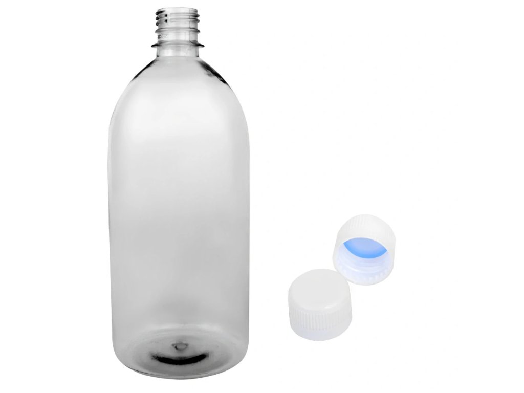 🧴 Priehľadná plastová fľaša s objemom 1 liter s klasickým bielym uzáverom. Vhodná na skladovanie aj aplikáciu širokej škály tekutín – od čistiacich roztokov až po potravinové doplnky.